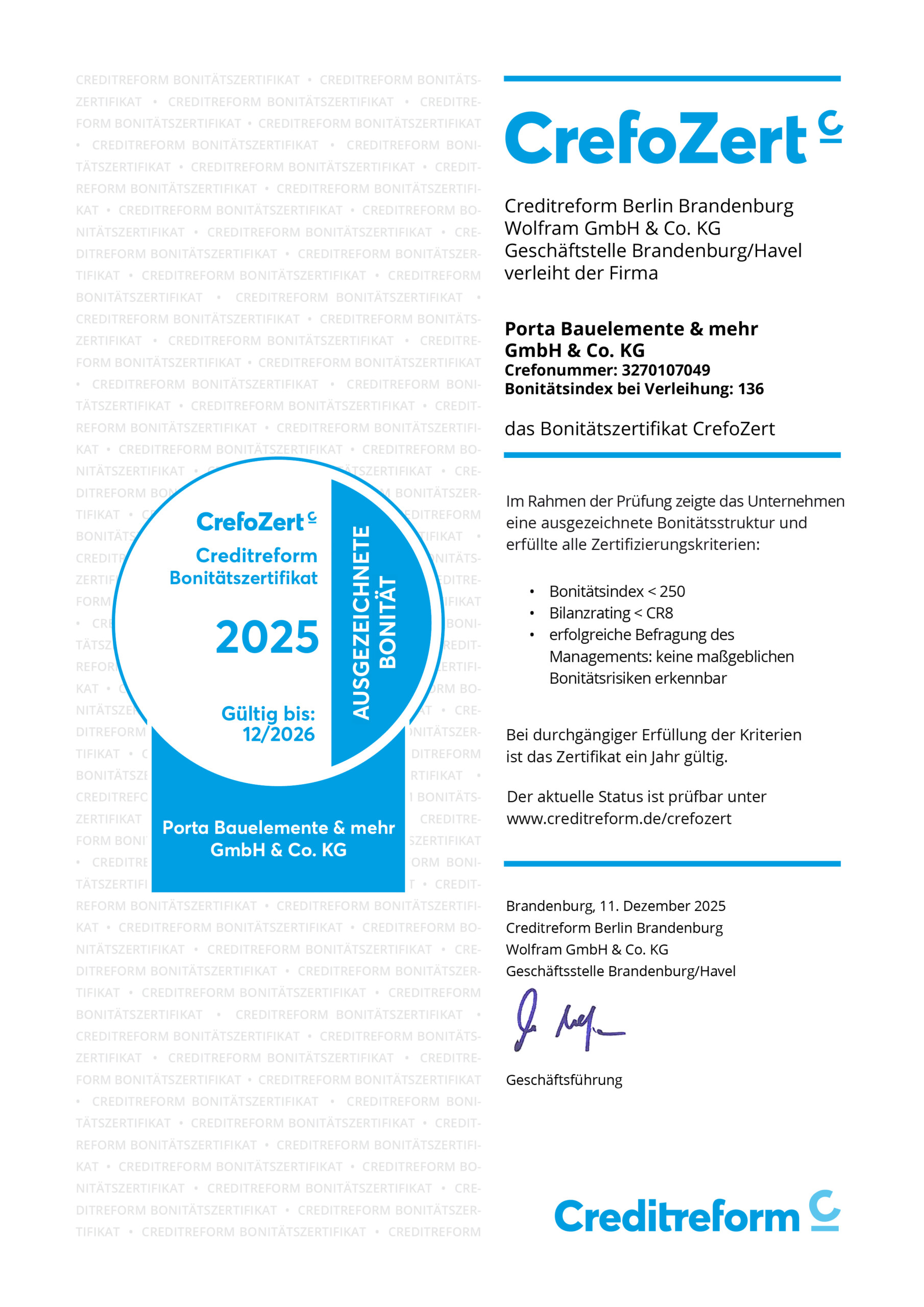 Das CrefoZert ist ein Bonitätszertifikat, das von der Creditreform an Unternehmen verliehen wird, die ihre wirtschaftliche Stabilität und Zahlungsfähigkeit besonders gut unter Beweis stellen. Ziel dieses Zertifikats ist es, Vertrauen gegenüber Geschäftspartnern, Kunden und potenziellen Investoren zu stärken und dem Unternehmen Wettbewerbsvorteile zu verschaffen. Jährlich erhalten etwa 1.000 mittelständische Unternehmen in Deutschland diese Auszeichnung, was sie in den Kreis der besten 2 % in Bezug auf Bonität einordnet